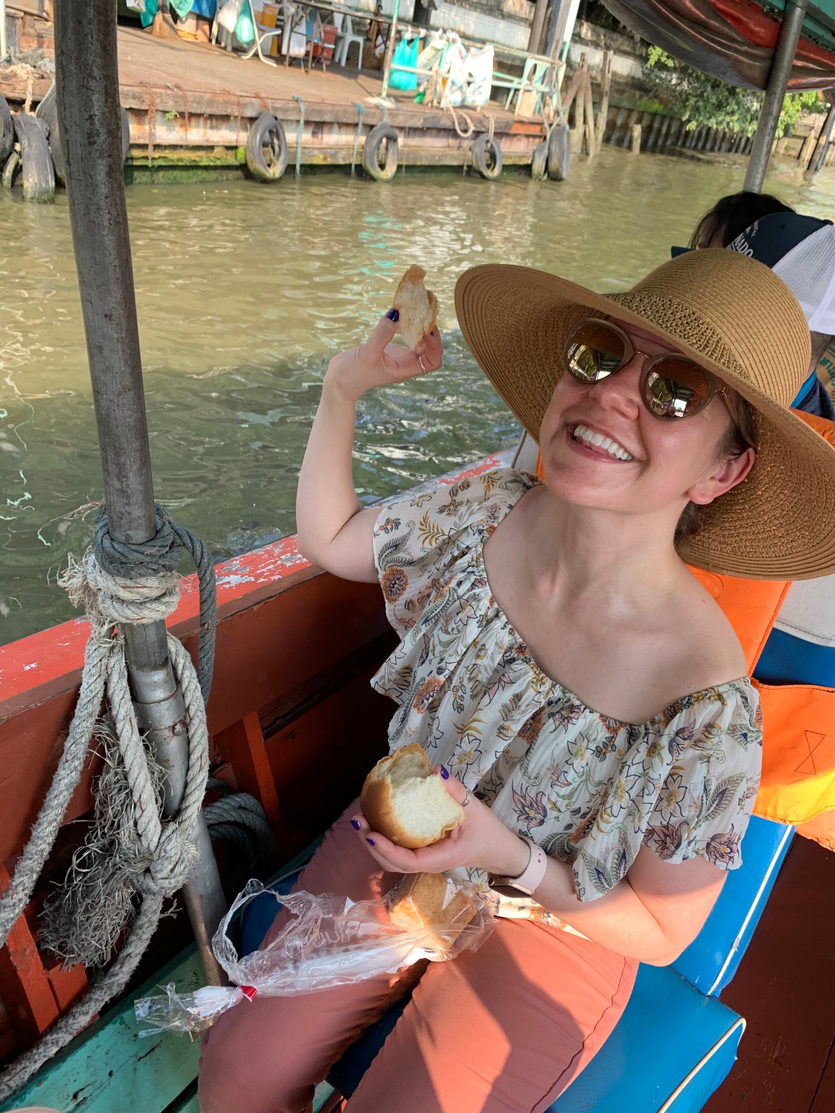 The boat tour was fun – we got on this rickety looking boat – the Thai people’s version of docking a boat is not a very safe one in my eyes. Andy hopped on first – and I took one look at the set up and realized that there was a strong likelihood I would end up in the water. With a little help we all safely boarded. The boat took us down a canal – and there is a spot where the Thai people (And of course hundreds of tourists each year) throw bread over the side of the boat for good luck. Feeding the fish is considered good luck. These fish come out of no where when they see that the boat has stopped.