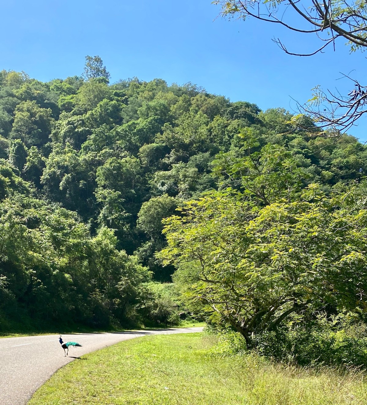 (Why did the peacock cross the road? Because we were heading his way at a frightening speed!)