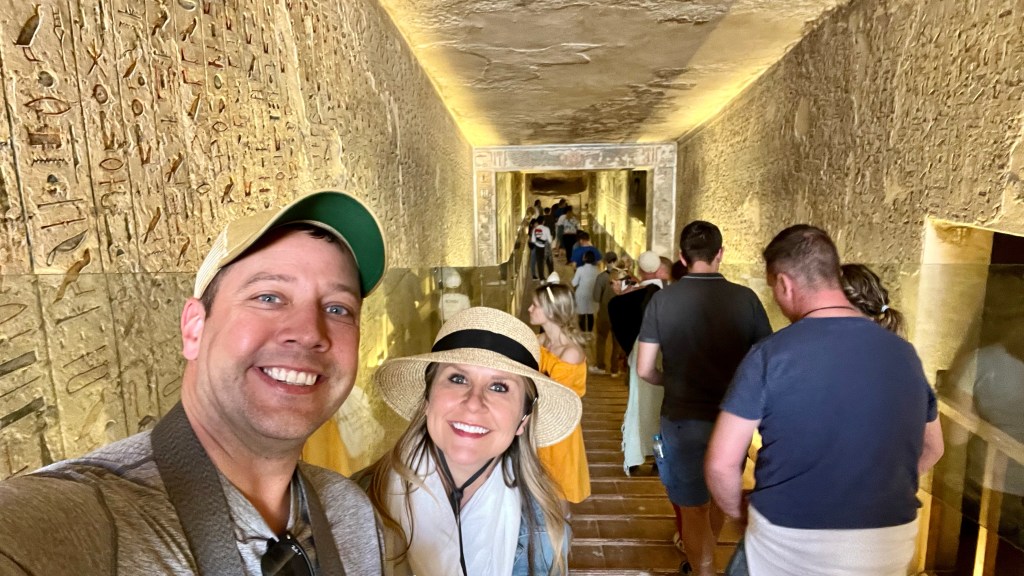 As we were walking out, we had decided to pick up a few souvenirs from the market. As Andy was reaching out to pay one man for our guide book, another man put a fake scarab in his hand. He was suggesting that Andy had to pay for it – and of course, Andy, thinking on his feet noticed the man had long sleeves. He quickly put the scarab in the man’s sleeve and walked away without any hassle as the Egyptians like to say. Moral of the story: never have an open hand in the market. 😂