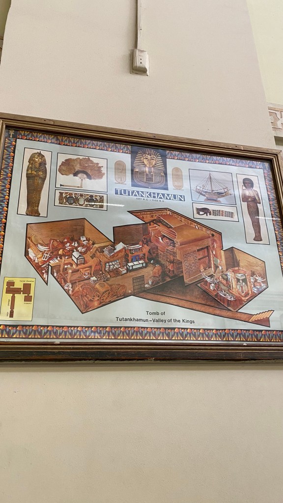 King Tutankhamun (Tut!) Unfortunately, you have to pay extra to see it. However, if you saw our pictures from the Egyptian museum – you actually already got to see a lot of his things! His tomb had been covered by rocks, which helped preserve it from discovery until 1922!
