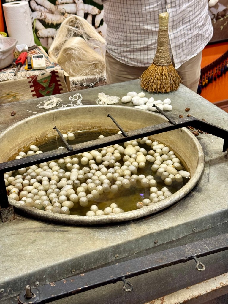 After we left Ephesus we went back into Kusadasi. Our tour brought us to a rug factory where they demonstrated how they gather silk from silk worms, and then they showed us how they make rugs. Of course, it’s a sales pitch. The couple next to us asked how much the smallest rug was – $1,300! Our guide had told us that we would get a group discount of 30%, so I tried to help them out and asked, “Is that with the 30%?” And the guy nodded, “Yes – that’s with the discount. Are you interested. Can I help you?!”
