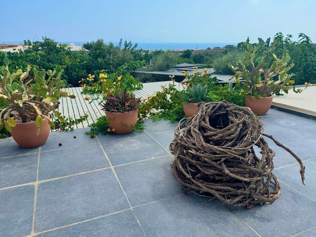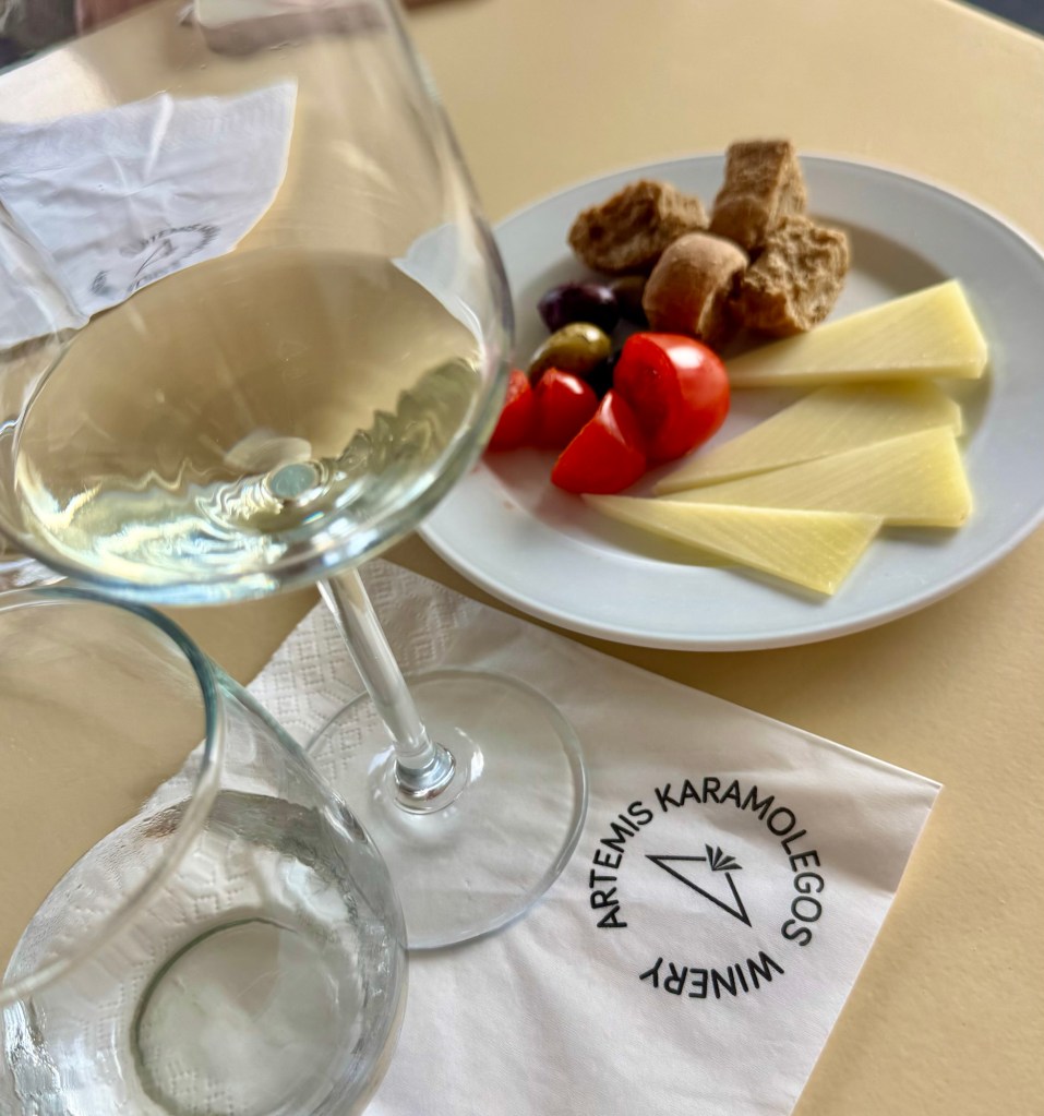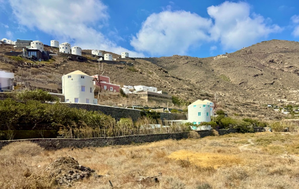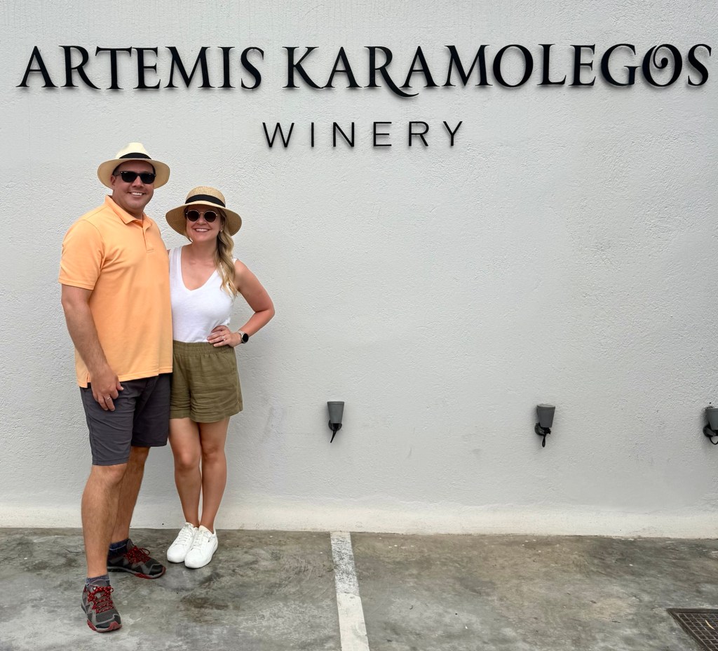 Our next stop was a winery – Artemis Karamolegos. We sampled three wines: a crisp white Assyrtiko, a dry rosé Assyrtiko, and a sweet wine that they were famous for, the Vinsanto. Santorini has some of the oldest grapes in Europe because they were resistant to phylloxera, which had devastated the rest of Europe’s vines. We enjoyed our time there before getting back on the bus for our last stop.
