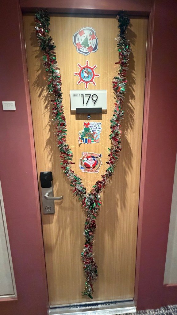We had a quick bite to eat and then we were surprised because our bags were already delivered to our room (that never happens!) and we were able to unpack early in the day. One of our favorite parts of cruising is only having to unpack once, but still getting to see a ton of new destinations. This time around we brought Christmas decorations to decorate our door – to give it a bit of festive flair!