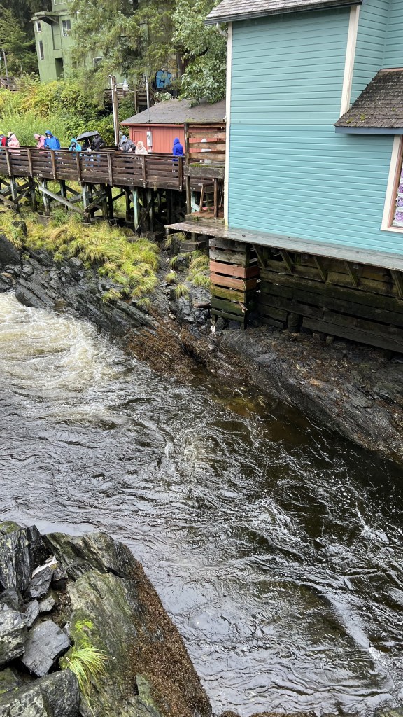 We also were able to walk past the creek that runs through town. It was incredibly interesting to learn that as salmon spawn their bodies actually start to change color and degrade. After they spawn, they die. We were visiting at the end of spawning season – so there were a lot of dead salmon in the water.