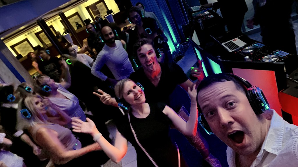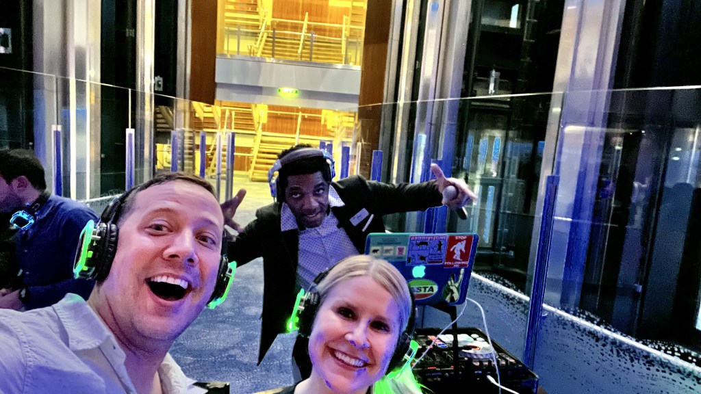 My parents decided to part ways and go back to their room, but we had one final activity before turning in. There was a silent disco DJ challenge. There were three different DJs playing different styles of music. You would pick a station: red, green, or blue. And the DJs were trying to get more people to listen to their channel.