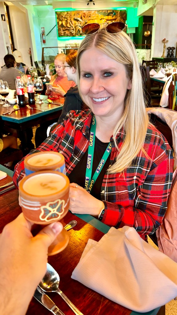 Once the walking tour wrapped up, we went to a nearby restaurant for a Pisco Sour demonstration. The Pisco Sour is the national drink in Peru – you see these everywhere on the menu! A Pisco Sour is a refreshing cocktail that typically includes Pisco (a white grape brandy), fresh lime juice, simple syrup, ice, and egg white. It’s shaken to perfection, creating a frothy and zesty drink.